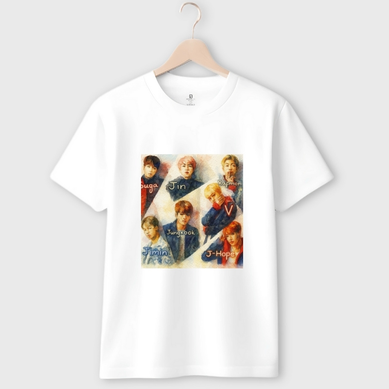 Dive into your fandom, featuring a watercolor-inspired illustration of BTS watercolour printed on premium T-shirt. The print showcases the band in a soft-wash pastel palette, giving a stylish artistic vibe rather than a typical bold graphic. Made from 100% premium ring-spun cotton (or equivalent blend) for comfort and durability, it holds its shape wash after wash.